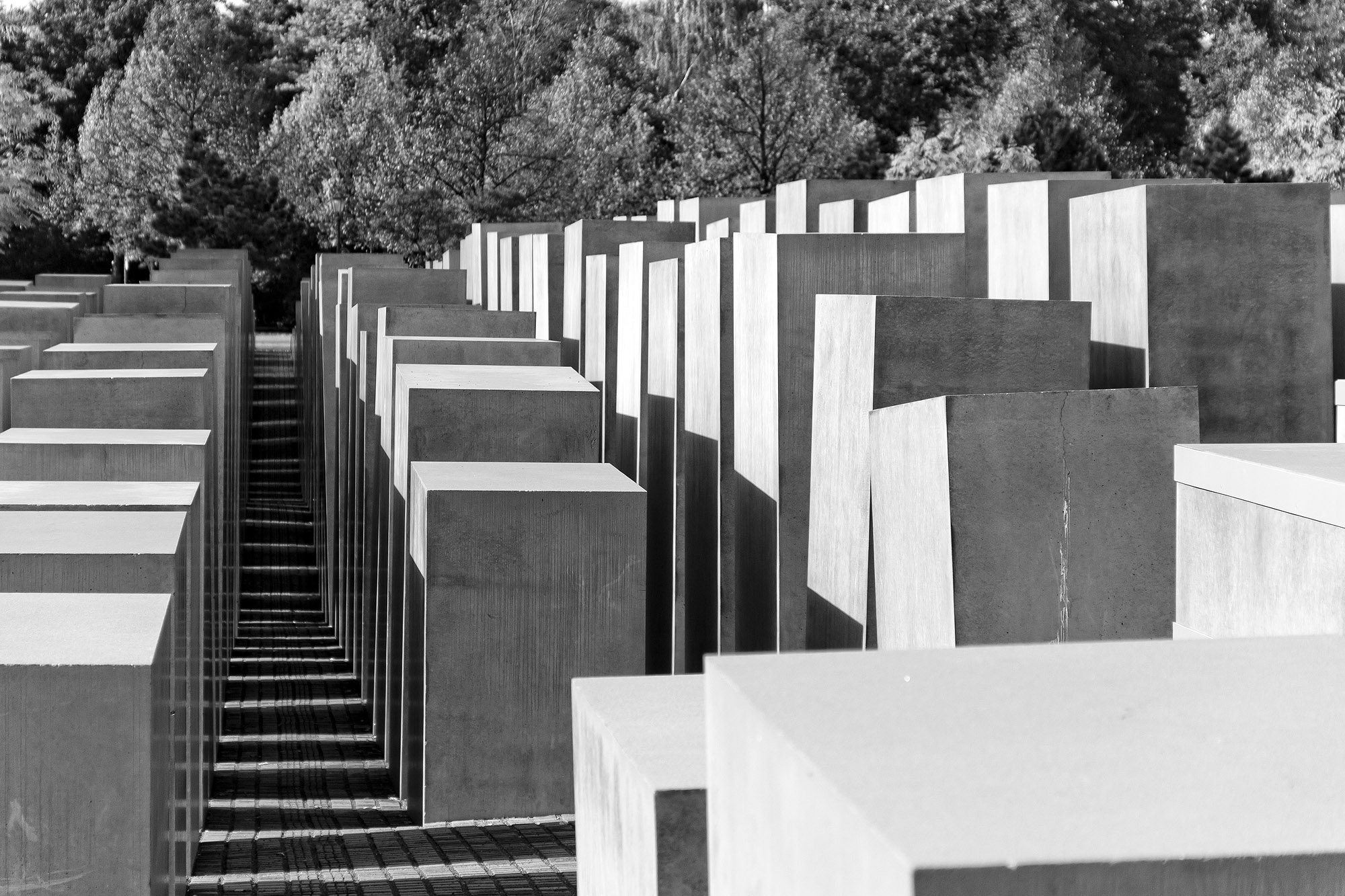 De reciente construcción, un bosque de bloques de hormigón de diferentes alturas que asemeja a un cementerio para conmemorar el Holocausto judío.